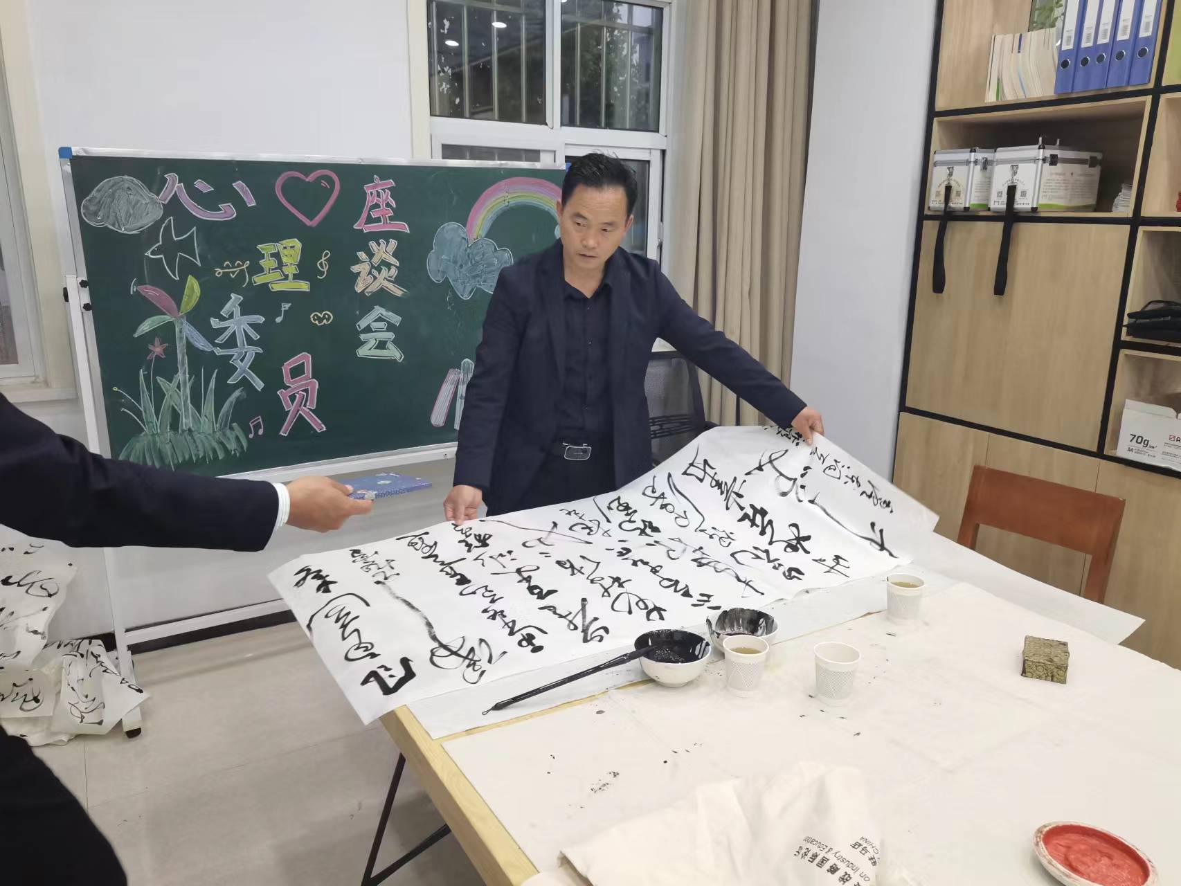 几位书协领导和书法绘画家游览了医学院校园及设施,就提高校园文化品位,增强书法绘画艺术及校园环境育人功能,布展书法绘画作品,进行了热心策划和指导,并挥毫泼墨,为医学院创作了六十幅书画作品,用以装饰美化图书阅览、自修室、办公室和会议室等场景。