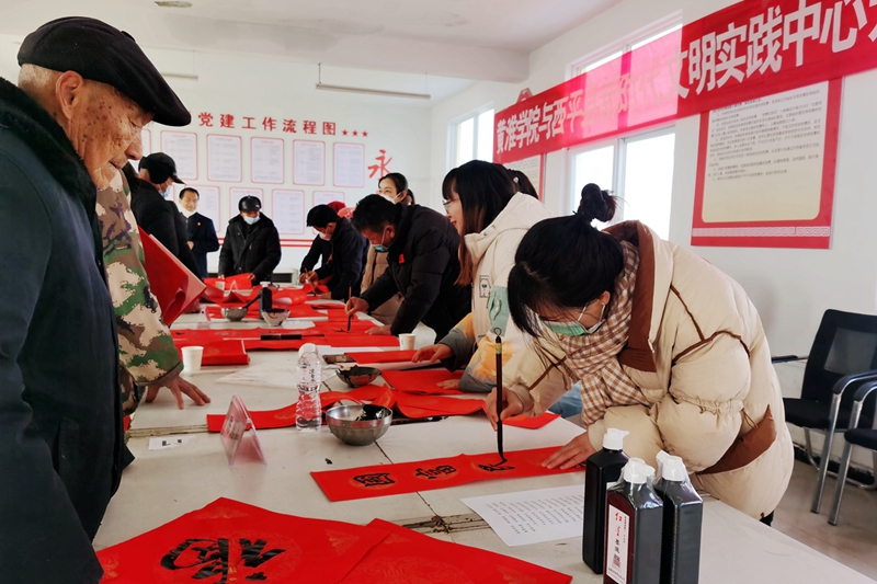 义写春联送祝福,浓浓墨香迎新春。1月17日,党委宣传部、金年会app手机版在线登录带领金年会app手机版在线登录职工书法协会与西平县新时代文明实践中心联合,到金年会app手机版在线登录定点帮扶西平县高庙村开展“迎新春 送祝福”义写春联活动。