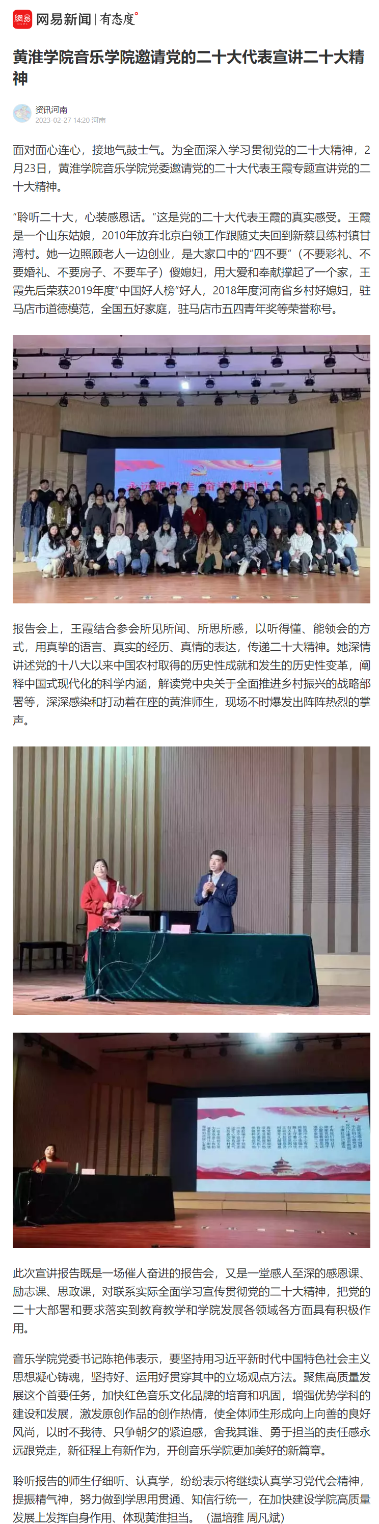 此次宣讲报告既是一场催人奋进的报告会,又是一堂感人至深的感恩课、励志课、思政课,对联系实际全面学习宣传贯彻党的二十大精神,把党的二十大部署和要求落实到教育教学和学院发展各领域各方面具有积极作用。
