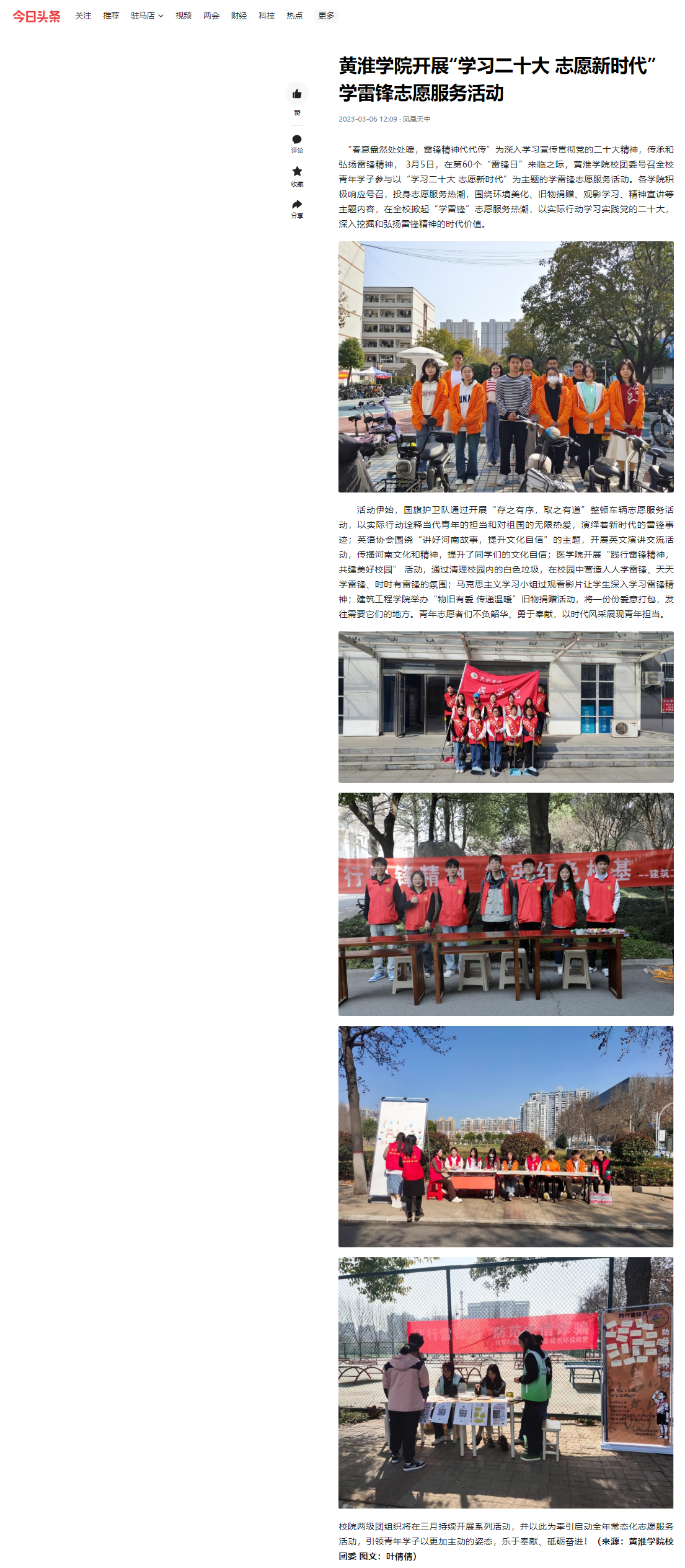 “春意盎然处处暖,雷锋精神代代传”为深入学习宣传贯彻党的二十大精神,传承和弘扬雷锋精神, 3月5日,在第60个“雷锋日”来临之际,校团委号召全校青年学子参与以“学习二十大 志愿新时代”为主题的学雷锋志愿服务活动。各学院积极响应号召,投身志愿服务热潮,围绕环境美化、旧物捐赠、观影学习、精神宣讲等主题内容,在全校掀起“学雷锋”志愿服务热潮,以实际行动学习实践党的二十大,深入挖掘和弘扬雷锋精神的时代价值。
