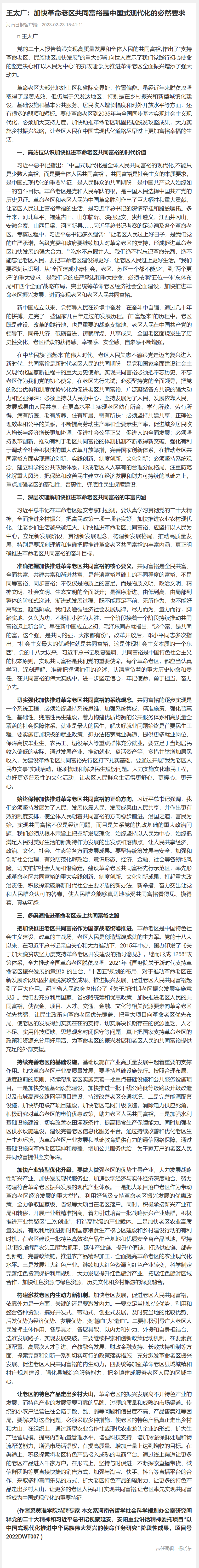 把加快推进老区共同富裕作为国家战略统筹推进。革命老区是中国特色社会主义建设、改革的主战场,老区人民是创造辉煌成就的生力军。党的十八大以来,在习近平总书记亲自关心和大力推动下,2015年中办、国办印发了《关于加大脱贫攻坚力度支持革命老区开发建设的指导意见》,继而形成“1258”政策体系,全力推动全国革命老区脱贫攻坚;2021年《国务院关于新时代支持革命老区振兴发展的意见》的出台、“十四五”规划的布局,对于推动革命老区在新发展阶段巩固拓展脱贫攻坚成果、推进振兴发展、促进老区人民共同富裕起到了巨大作用。河南省人民政府也出台了《关于新时期老区振兴发展实施意见》。我们要充分利用国家、省战略统筹和优惠政策,加快推进老区人民的共同富裕,使资金、项目、人才、交通、金融、文化等相关资源要素向革命老区优先集聚,让民生政策向革命老区优先覆盖,把重大项目向革命老区优先布局,使老区的发展得到实实在在的支持,切实解决长期存在的资源匮乏、人才不足、实用科技短缺、思想观念封闭保守等问题,真正把国家支持革命老区的政策和资源充分用好用活,为革命老区的振兴发展和老区人民的共同富裕提供充足的外部支援。
