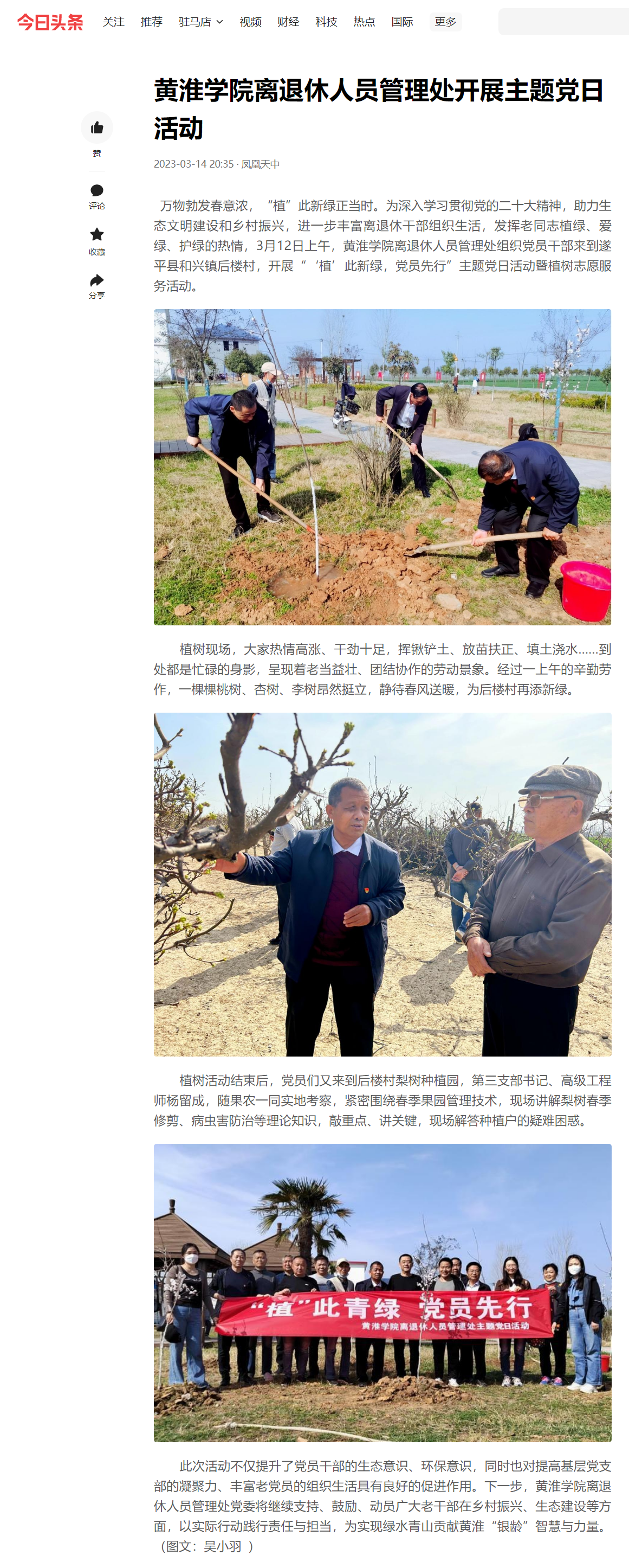 万物勃发春意浓,“植”此新绿正当时。为深入学习贯彻党的二十大精神,助力生态文明建设和乡村振兴,进一步丰富离退休干部组织生活,发挥老同志植绿、爱绿、护绿的热情,3月12日上午,金年会app手机版在线登录离退休人员管理处组织党员干部来到遂平县和兴镇后楼村,开展“‘植’此新绿,党员先行”主题党日活动暨植树志愿服务活动。