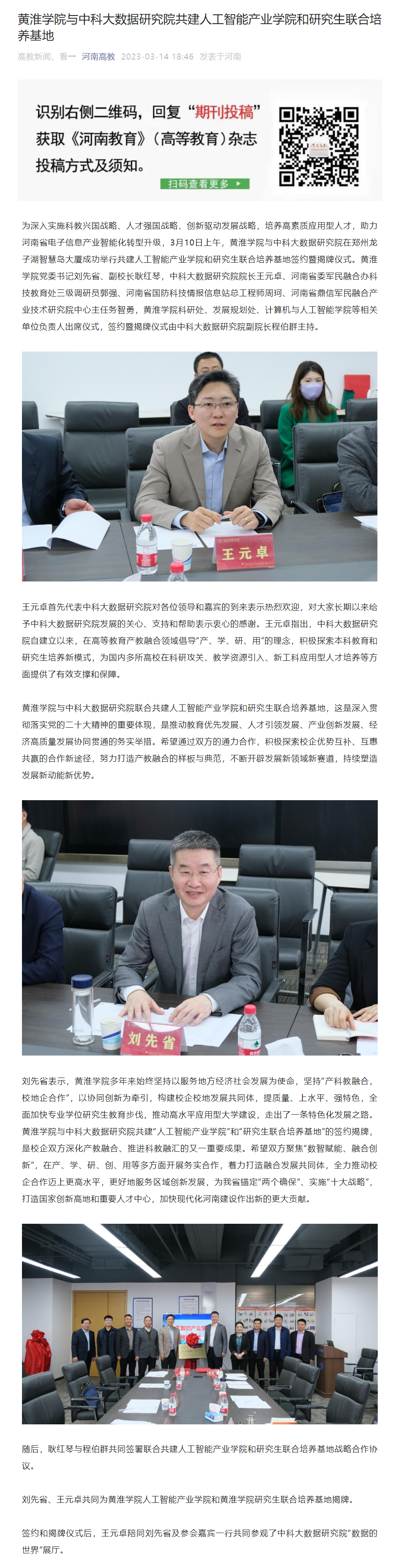为深入实施科教兴国战略、人才强国战略、创新驱动发展战略,培养高素质应用型人才,助力河南省电子信息产业智能化转型升级。3月10日上午,金年会app手机版在线登录与中科大数据研究院在郑州龙子湖智慧岛大厦成功举行共建人工智能产业学院和研究生联合培养基地签约暨揭牌仪式。金年会app手机版在线登录党委书记刘先省、副校长耿红琴,中科大数据研究院院长王元卓、河南省委军民融合办科技教育处三级调研员郭强、河南省国防科技情报信息站总工程师周珂、河南省鼎信军民融合产业技术研究院中心主任务智勇,金年会app手机版在线登录科研处、发展规划处、计算机与人工智能学院等相关单位负责人出席仪式,签约暨揭牌仪式由中科大数据研究院副院长程伯群主持。