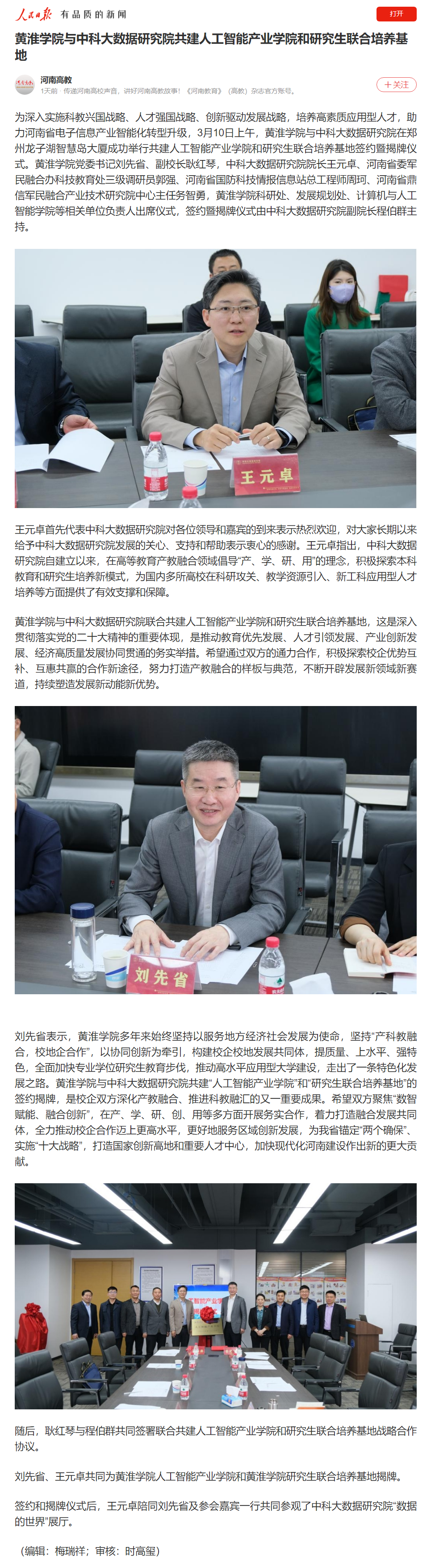 金年会app手机版在线登录与中科大数据研究院联合共建人工智能产业学院和研究生联合培养基地,这是深入贯彻落实党的二十大精神的重要体现,是推动教育优先发展、人才引领发展、产业创新发展、经济高质量发展协同贯通的务实举措。希望通过双方的通力合作,积极探索校企优势互补、互惠共赢的合作新途径,努力打造产教融合的样板与典范,不断开辟发展新领域新赛道,持续塑造发展新动能新优势。