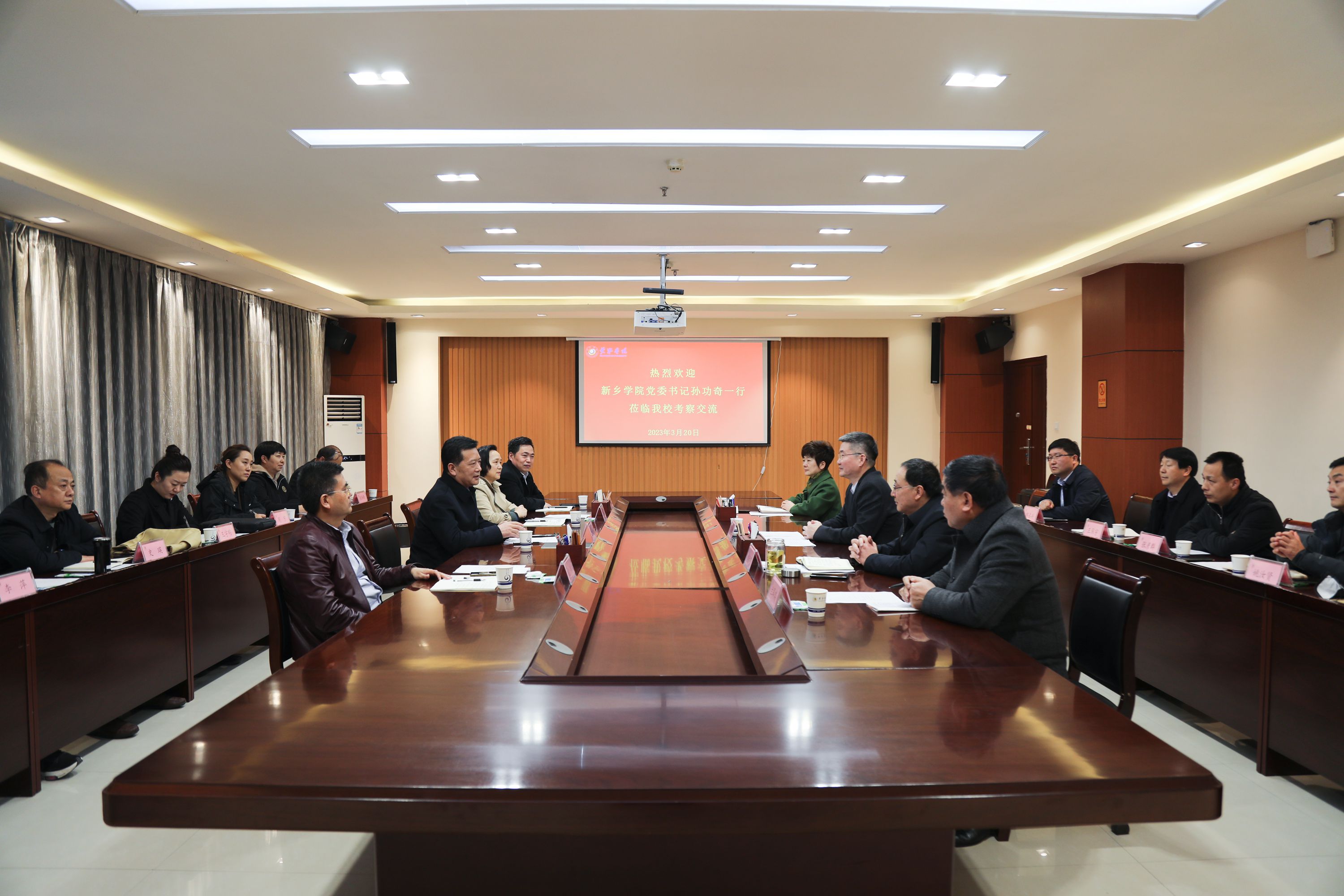 3月20日下午,新乡学院党委书记孙功奇、校长尹新明一行到金年会app手机版在线登录考察交流。金年会app手机版在线登录党委书记刘先省、校长刘彦明亲切会见来访客人。座谈会在综合楼602会议室举行,双方校领导、党政办公室、科研处、国际交流合作处、团委、发展规划处、教务处相关负责同志出席。