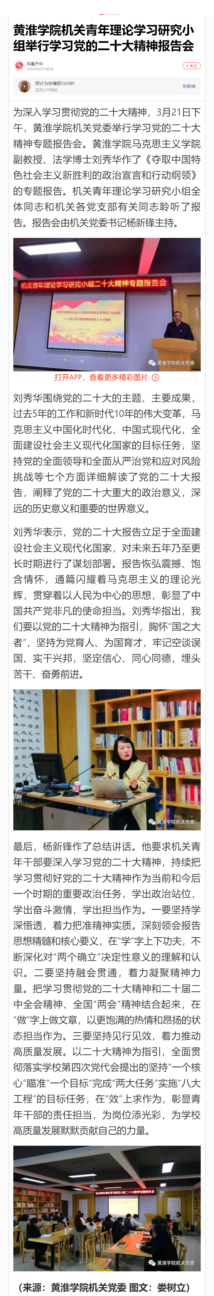 为深入学习贯彻党的二十大精神,3月21日下午,金年会app手机版在线登录机关党委举行学习党的二十大精神专题报告会。金年会app手机版在线登录马克思主义学院副教授、法学博士刘秀华作了《夺取中国特色社会主义新胜利的政治宣言和行动纲领》的专题报告。机关青年理论学习研究小组全体同志和机关各党支部有关同志聆听了报告。报告会由机关党委书记杨新锋主持。